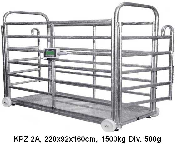 KPZ 2A, Váha na zvířata, váha rozměr plošiny 2200 x 920 x 1785 mm, velmi stabilní a robustní svařovaná ocelová plošina ( rozměry: ca. 2200 x 920 mm), kompletně se stabilním ohrazením , kompletně ŽÁRUVZDORNĚ POZINKOVANÁ